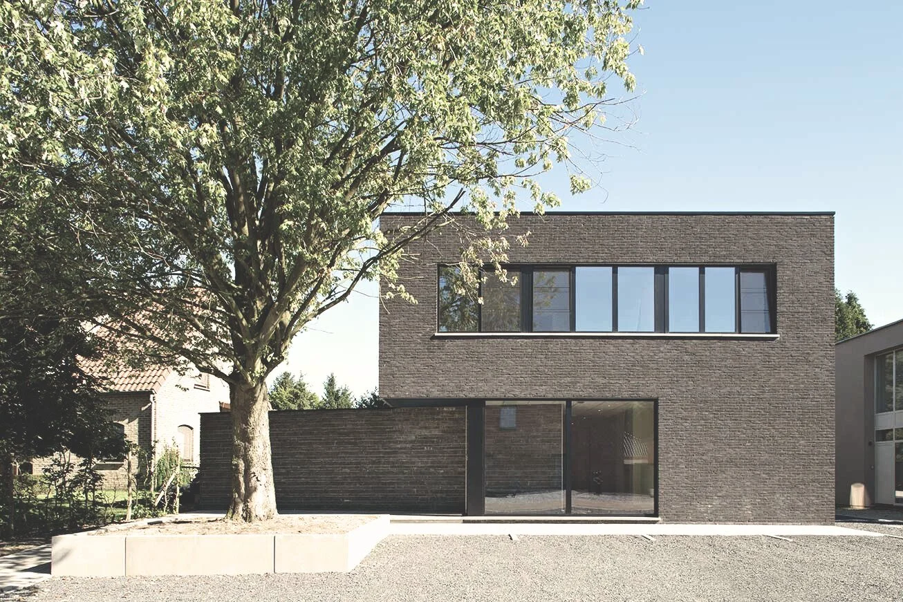 De inkom is aan de rechterzijde van het gebouw via de trap.